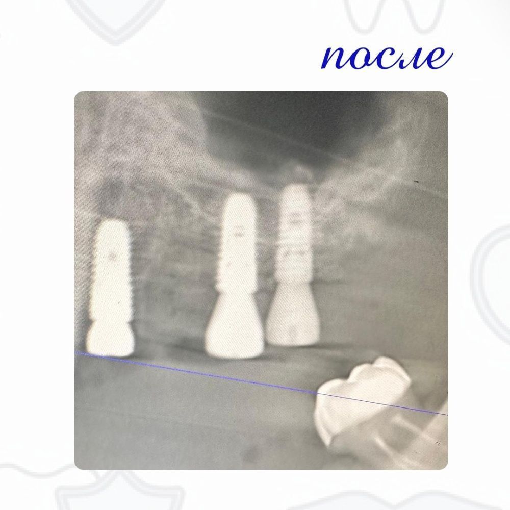 В ходе операции были установлены дентальные имплантаты с одновременным наращиванием костной ткани по методу открытого синус-лифтинга. По истечении пяти месяцев пациенту была установлена мостовидная конструкция на дентальных имплантах.