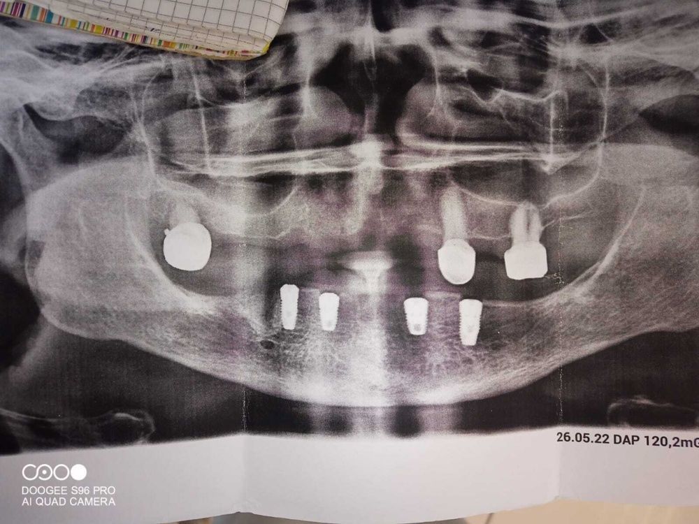 К нам в клинику, к доктору Шаймарданову Ф.Т., обратилась пациентка И. с жалобами на полное отсутствие зубов в нижней челюсти и невозможность ношения полного съемного пластинчатого протеза, так как он не фиксируется на нижней челюсти. Врач предложил установить 4 имплантата в нижнюю челюсть с дальнейшим протезированием балочной системы условно съемного пластинчатого протеза с опорой на имплантаты. Такой протез хорошо фиксируется на имплантатах и обеспечивает удобные условия для гигиены полости рта и протеза.
