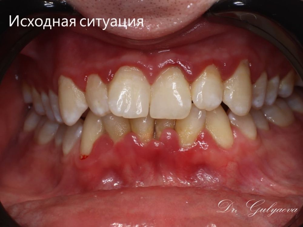 Пациент обратился с жалобами на кровоточивость, боли в десне и нарушение эстетики улыбки.